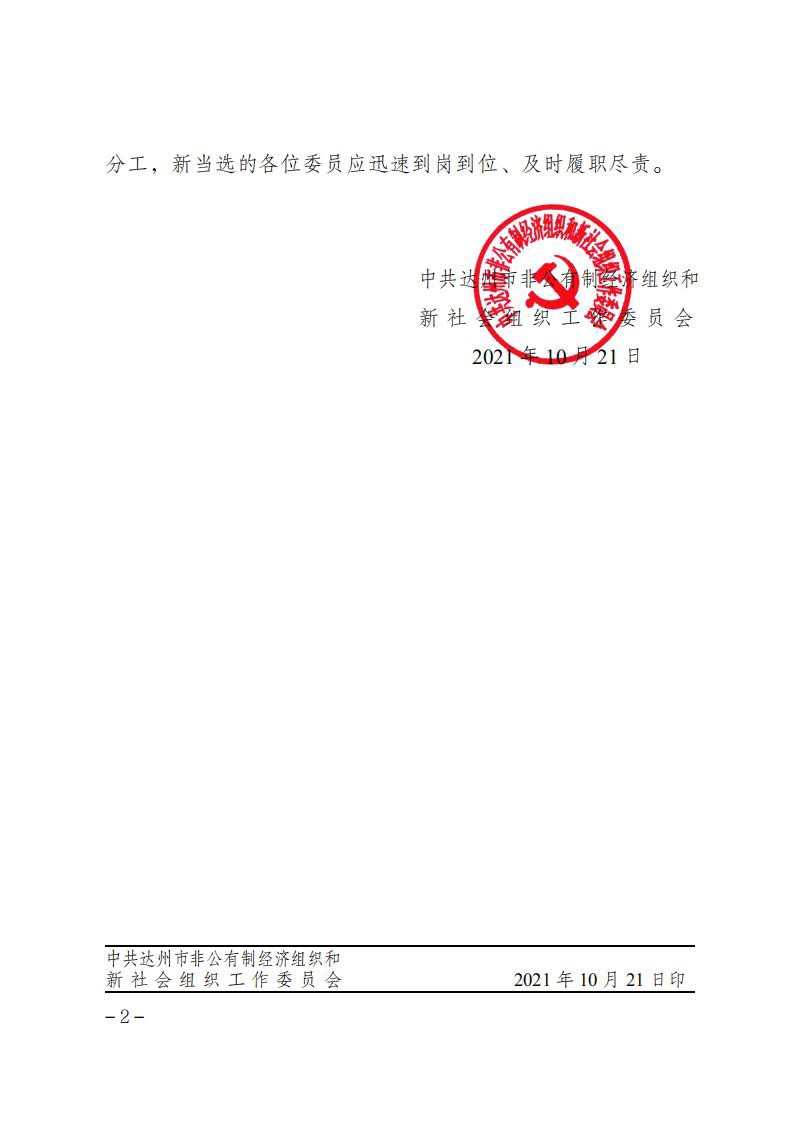 10月21日,中共达州市非公有制组织和新社会组织工作委员会(简称:两新党工委)给中国共产党taptap最新版官方下载链接委员会发文《关于同意中国共产党taptap最新版官方下载链接委员会选举结果的批复》(达市两新【2021】13号委),标志中国共产党taptap最新版官方下载链接委员会领导班子正式建立。