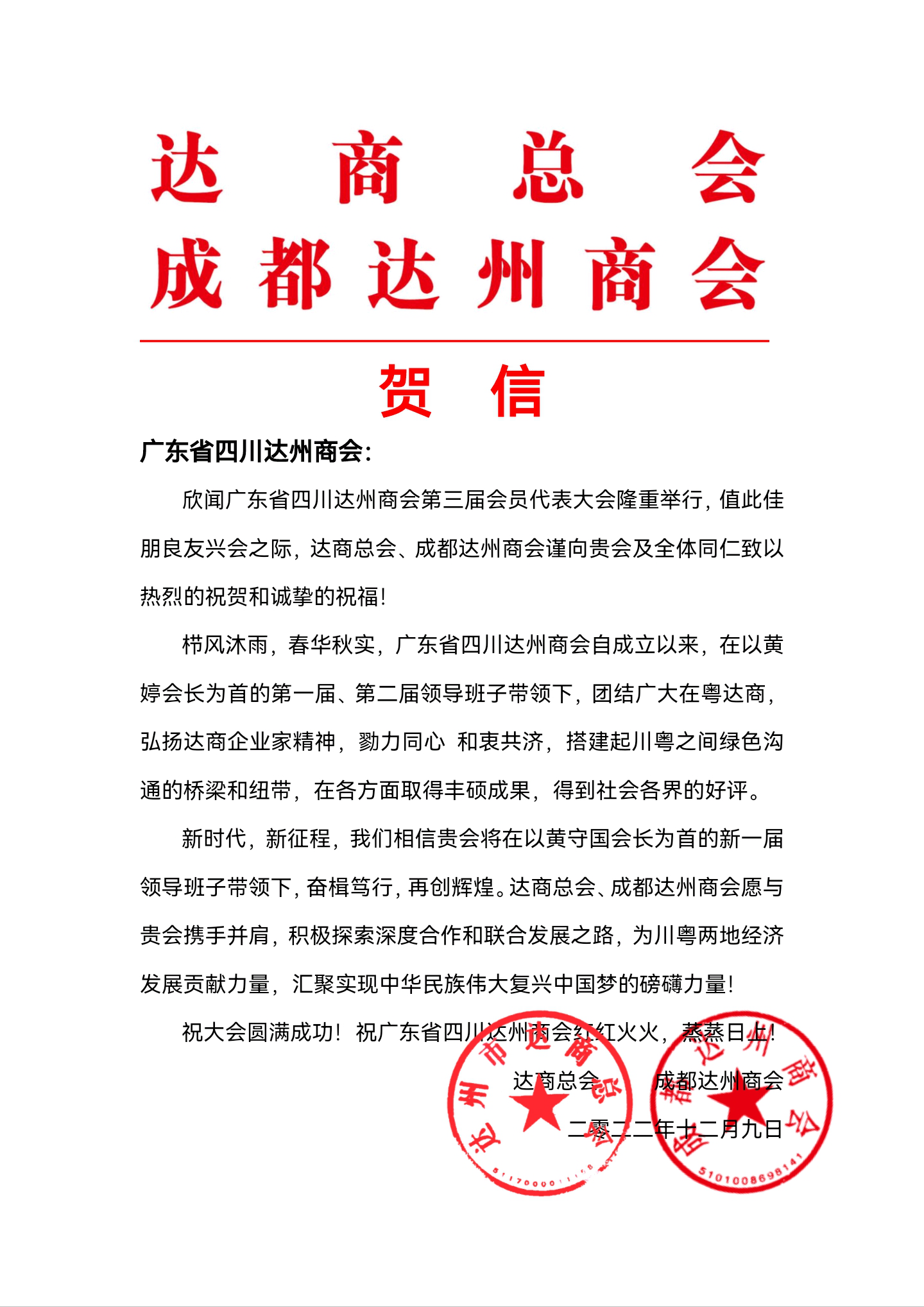 衷心祝愿广东省四川达州商会在新一届领导班子带领下,踔厉奋发,奋楫笃行,云程发轫,万里可期!希望广东省四川达州商会在新时代新征程的伟业中,搭建川粤沟通和经贸交流的绿色桥梁,为民营经济发展贡献力量,汇聚实现中华民族伟大复兴中国梦的磅礴力量!