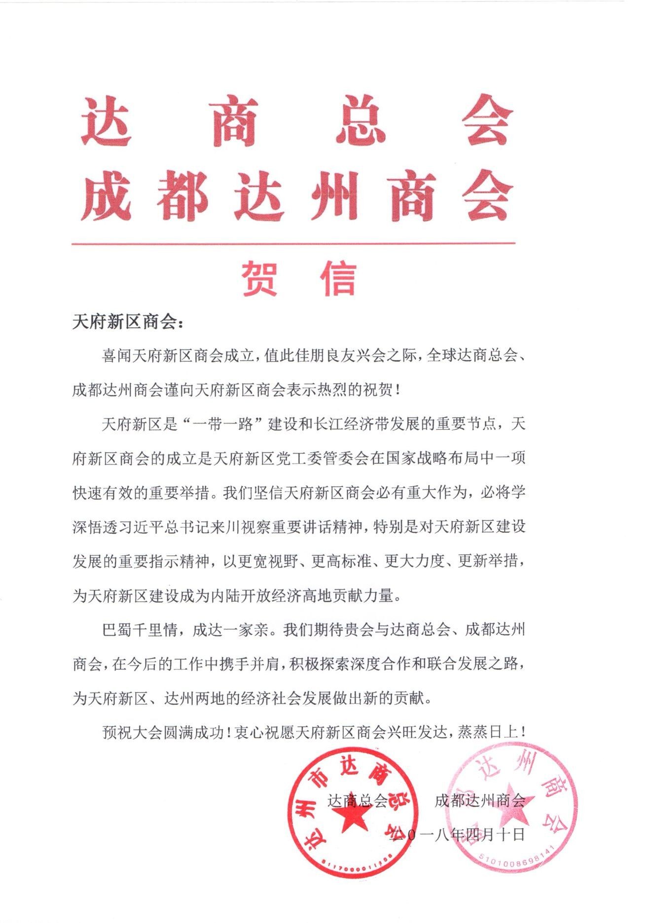 4月18日上午,天府新区商会成立大会在中国西部国际博览城隆重举行。全国工商联副主席、四川省政协副主席、四川省工商联主席陈放向天府新区商会成立发来贺词。四川省人民政府副省长杨兴平,成都市政协副主席、天府新区成都党工委书记杨林兴、省工商联副主席孙宁、四川天府新区管委会办公室常务副主任、天府新区成都党工委副书记、天府新区成都管委会主任刘任远、成都市委统战部副部长、市工商联党组书记黎邦华等领导出席了大会。taptap点点登陆会长、成都达州商会会长刘峙宏,taptap点点登陆执行常务副会长兼秘书长、成都达州商会党委书记郑权国应邀出席大会,并向天府新区商会及新当选王麒会长致以热烈的祝贺和诚挚的祝福。