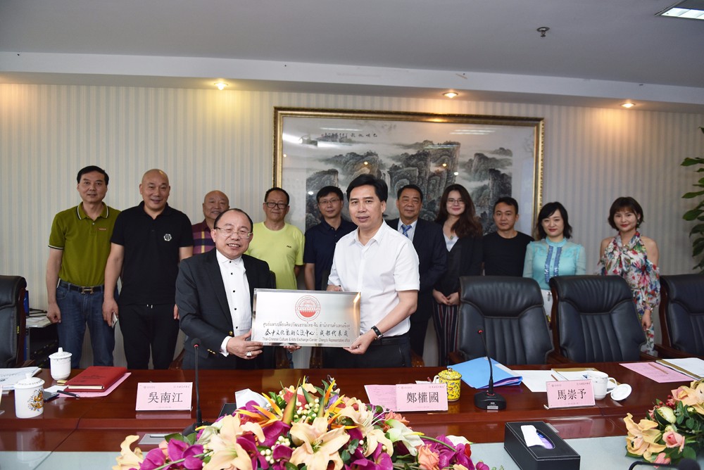 随后,我会执行常务副会长兼秘书长郑权国同吴南江总裁分别代表 与泰中文化艺术交流中心签订了战略合作协议。吴南江总裁代表泰中文化艺术交流中心,向 授予了“泰中文化艺术交流中心成都代表处”牌匾;郑权国秘书长代表 ,向泰中文化艺术交流中心授予了“中国· 泰国代表处”牌匾。