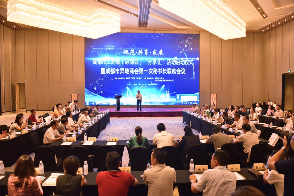 7月18日下午,由成都市工商联(总商会)主办,成都遂宁商会及四川沱牌舍得营销有限公司承办的“分享·汇”活动启动仪式暨成都市异地商会第一次秘书长联席会议在首座万豪酒店圆满举行。中共成都市委统战部副部长、成都市工商联党组书记黎邦华、成都市工商联副主席温莉艳、成都市工商联秘书长章南南、遂宁市人民政府驻蓉办事处主任蒋晟、成都市工商联会员处处长钟琦等领导,成都遂宁商会会长王毅、成都遂宁商会执行会长李映龙以及来自成都各异地商会秘书长等近70位嘉宾出席本次活动。成都达州商会党委书记、秘书长郑权国受邀参加此次会议,并作代表发言。