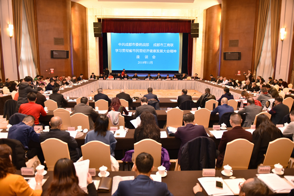 11月26日,中共成都市委统战部、成都市工商联召开学习贯彻省市民营经济健康发展大会精神座谈会,会议传达学习了省市民营经济健康发展大会精神和范锐平书记在大会上发表的重要讲话主要精神。同时,就下步学习贯彻省市民营经济健康发展大会精神作出安排部署。成都市工商联领导班子成员及机关干部,兼职企业家副主席、副会长,直属商会代表共170余人出席会议。