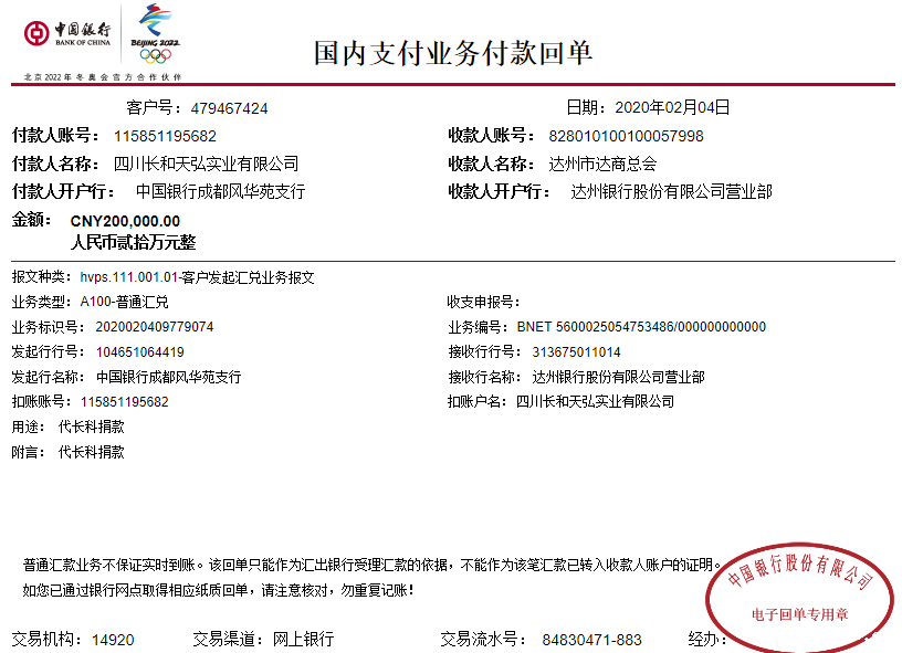 (图为海南长科集团以四川长和天弘事业有限公司账户捐赠汇款单,并委托taptap点点登陆捐赠给武汉红十字会)
