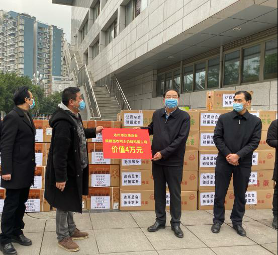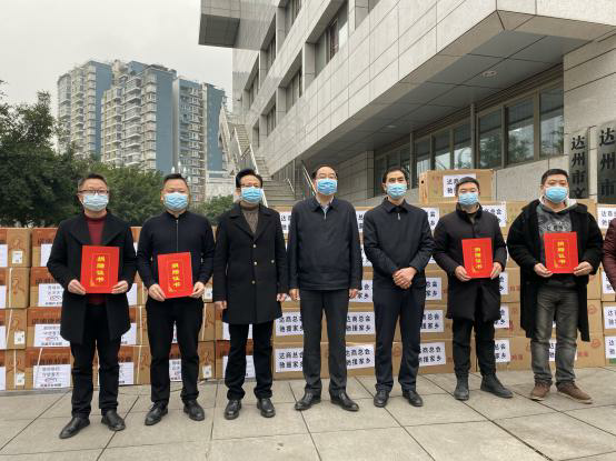 2月25日, 秘书处携咨询委员会副主任单位西藏药业一起为达州家乡捐赠物资。捐赠仪式在达州市应对新型冠状病毒肺炎疫情应急指挥部举行,市委常委、宣传部部长、市直机关工委书记洪继诚、达州市工商联主席马兵等领导出席捐赠仪式。洪继诚对商会秘书处积极承担社会责任、为达州疫情防控贡献力量表示感谢,并颁发证书。