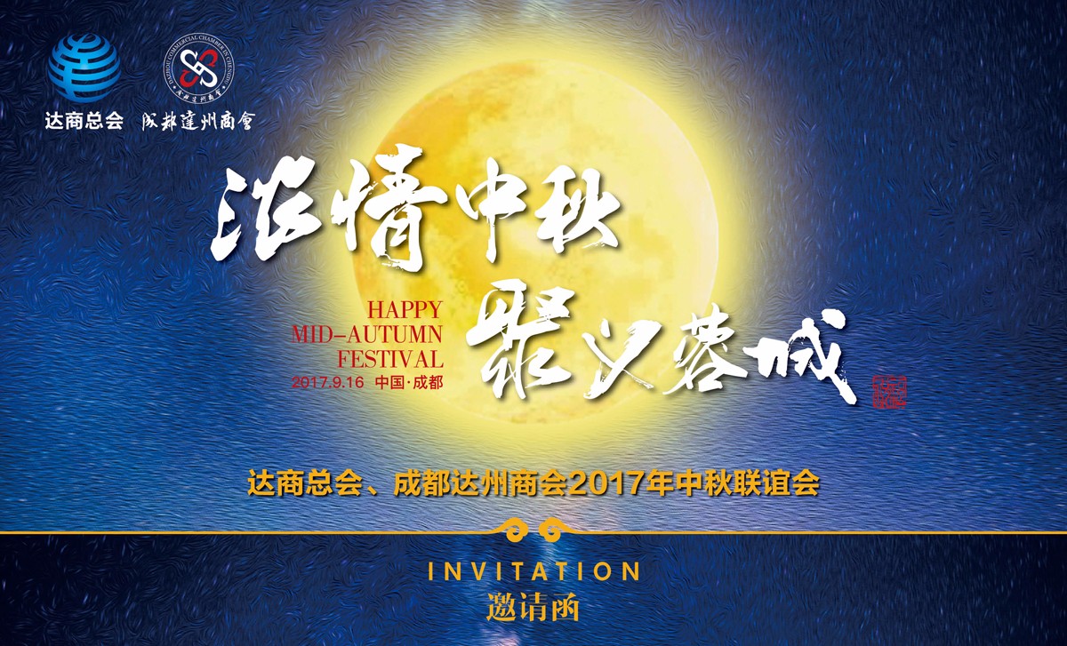 接达州市委、市政府通知,根据2017西部(四川)国际投资大会的总体安排,我会原定于9月15日召开的2017年中秋联谊会,因故变更日期。“浓情中秋,聚义蓉城”----- 、成都达州商会2017年中秋联谊会将于2017年9月16日(星期六)16:30---20:00在成都市滨江中路9号万达瑞华大酒店3楼大厅举行,特邀请您届时莅临。