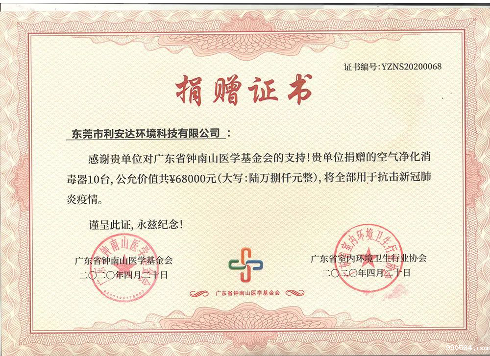 东莞市利安达环境科技有限公司在新冠疫情期间的一系列公益善举,充分发扬了“一方有难,八方支援”的民族精神。同时,获得广东省钟南山医学基金会的积极肯定与嘉奖。